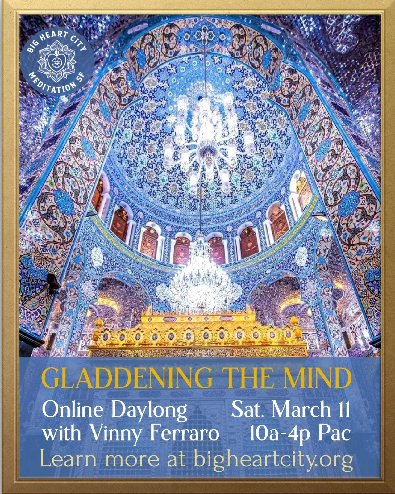 The Big Heart City sangha meets in person every first Friday of the month and on Zoom all other Fridays.